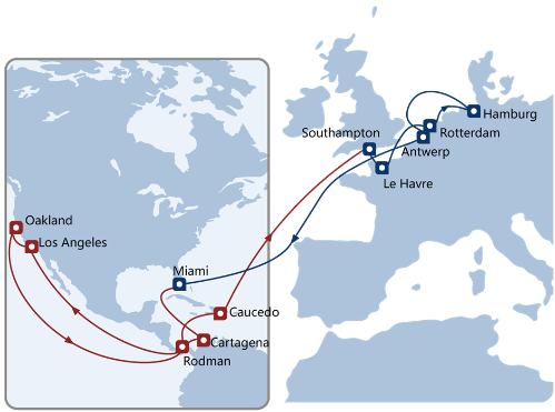 Moreover, COSCO SHIPPING Lines will initiate its first direct services from Northwest Europe to the West Coast of the United States, including Los Angeles and Oakland, via the Panama Canal. Details of the route names and Ports of call ELSA: Northwest Europe to Central America to West America Southampton - Le Havre - Rotterdam - Hamburg - Antwerp - Miami - Cartagena - (Panama Canal) - Rodman - Los Angeles - Auckland - Rodman - (Panama Canal) - Caucedo - Southampton